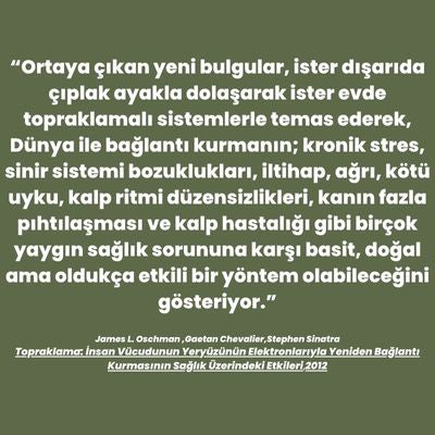 Topraklama ürünlerimiz topraklı prizlere takılmalarına rağmen elektrik taşımazlar. Sadece yer altına inen toprak hattına bağlanarak Dünya'nın enerjisini bedeninize taşırlar. Tıpkı ağaca sarılmak, çıplak ayakla kumsalda yürümek, denize girmek gibi...